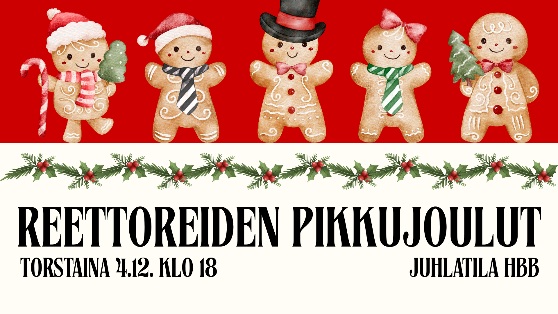 Pikkujouluissa on tarjolla joulupuuroja ja joulutorttuja. Lisäksi vuoden viimeisen reettorijuhlan kunniaksi tarjoillaan alkumalja sekä muita jouluisia herkkuja. Ruoan lisäksi luvassa on mm. Vuoden Reettori -äänestys, esityksiä ja ehkä jopa Joulupukin vierailu!🎅