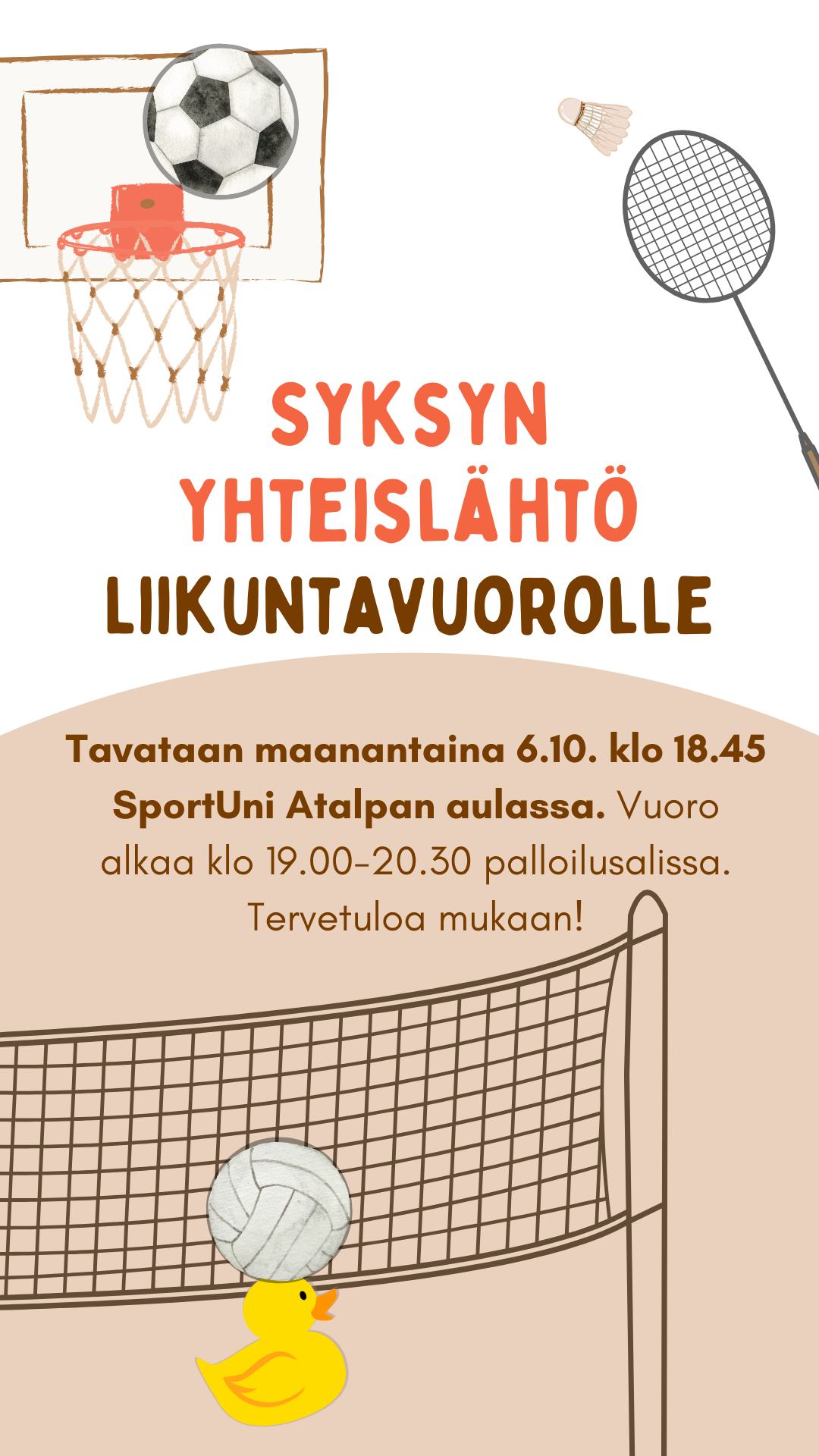 Tervetuloa Reettoreiden yhteislähdölle liikuntavuorolle maanantaina 6.10. klo 19.00-20.30. SportUni Atalpan palloilusalissa. Nähdään Atalpan aulassa klo 18.45 ja mennään sieltä yhdessä pukuhuoneiden kautta vuorolle.🏀🏸